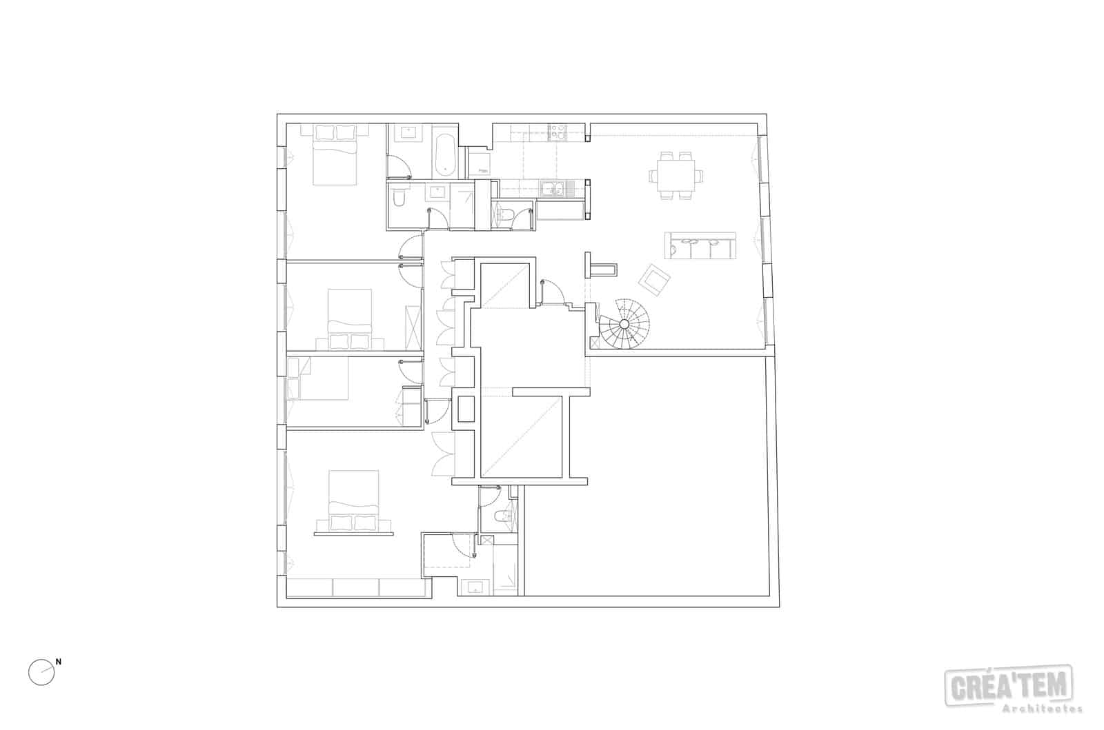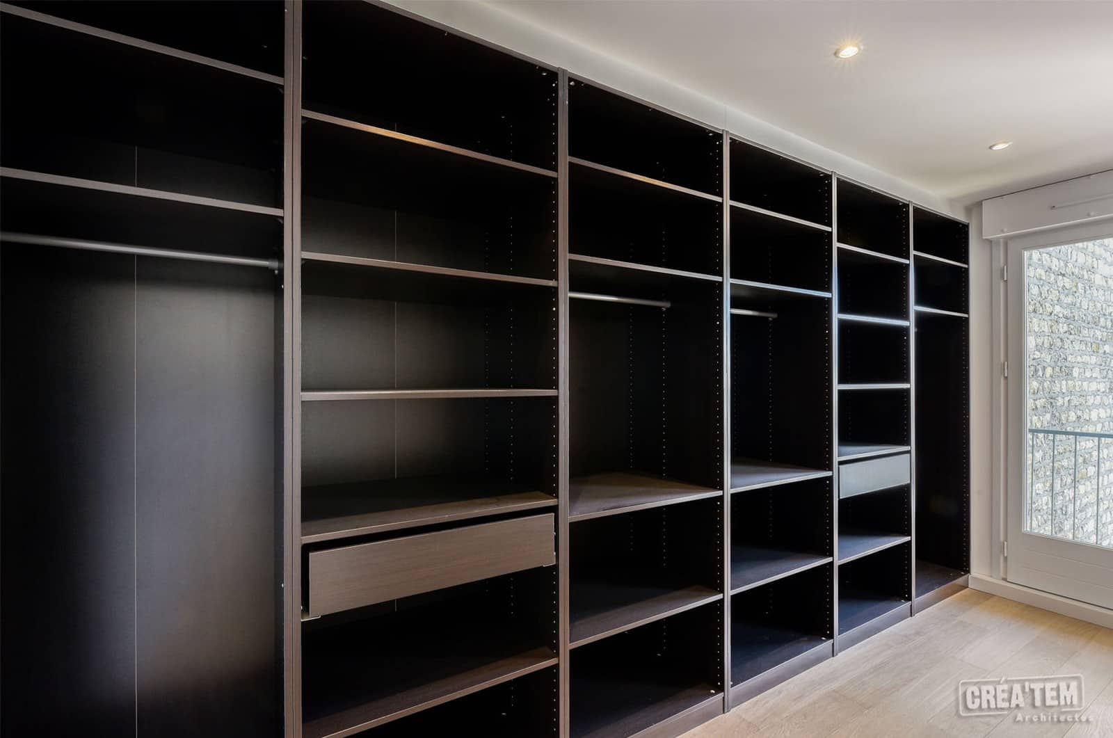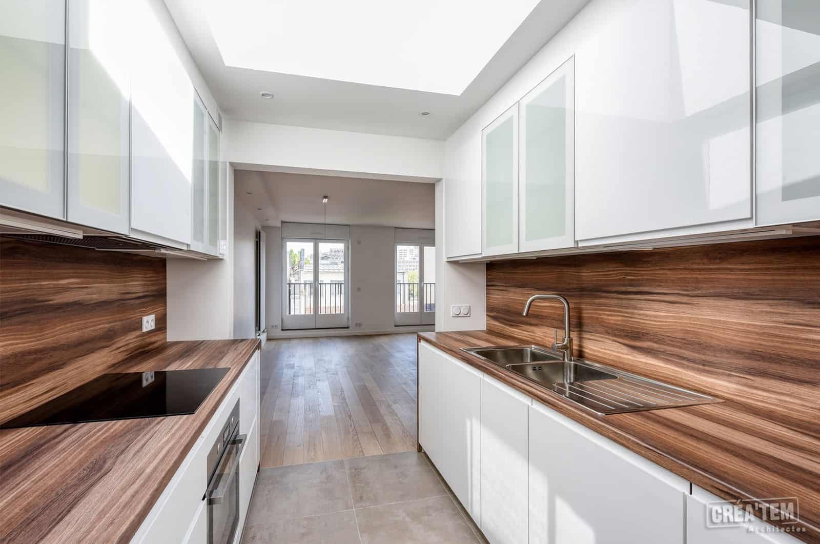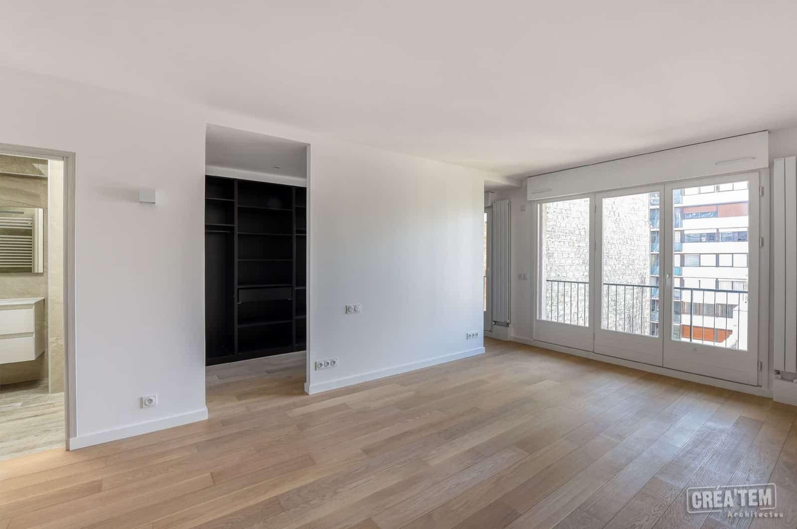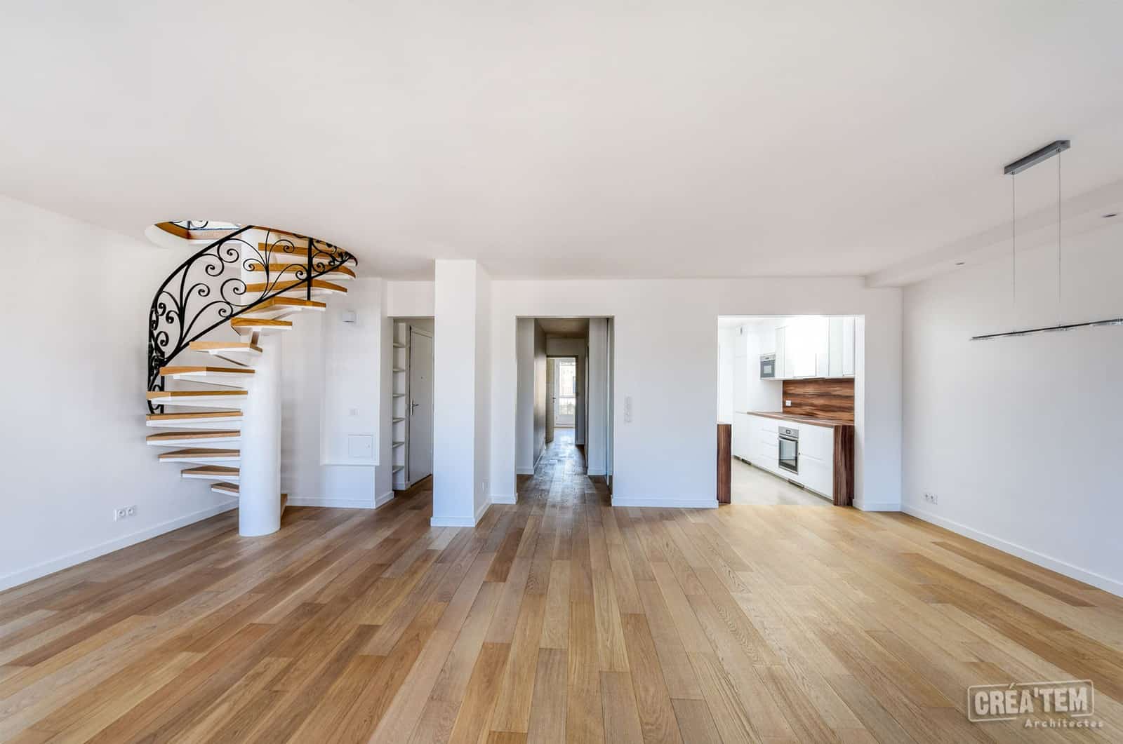 Situé dans le 13e arrondissement parisien, au dernier étage d’un immeuble des années 70, cet appartement a bénéficié d’une rénovation et d’une réorganisation totale, dans une volonté de décloisonner les espaces.