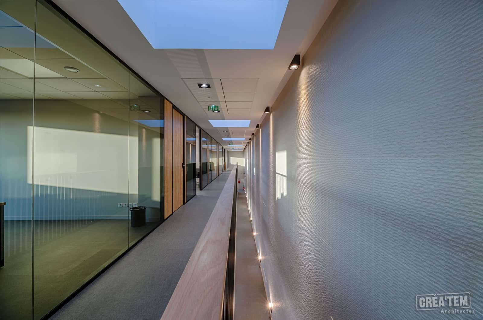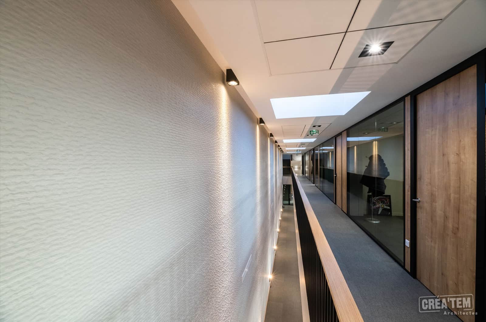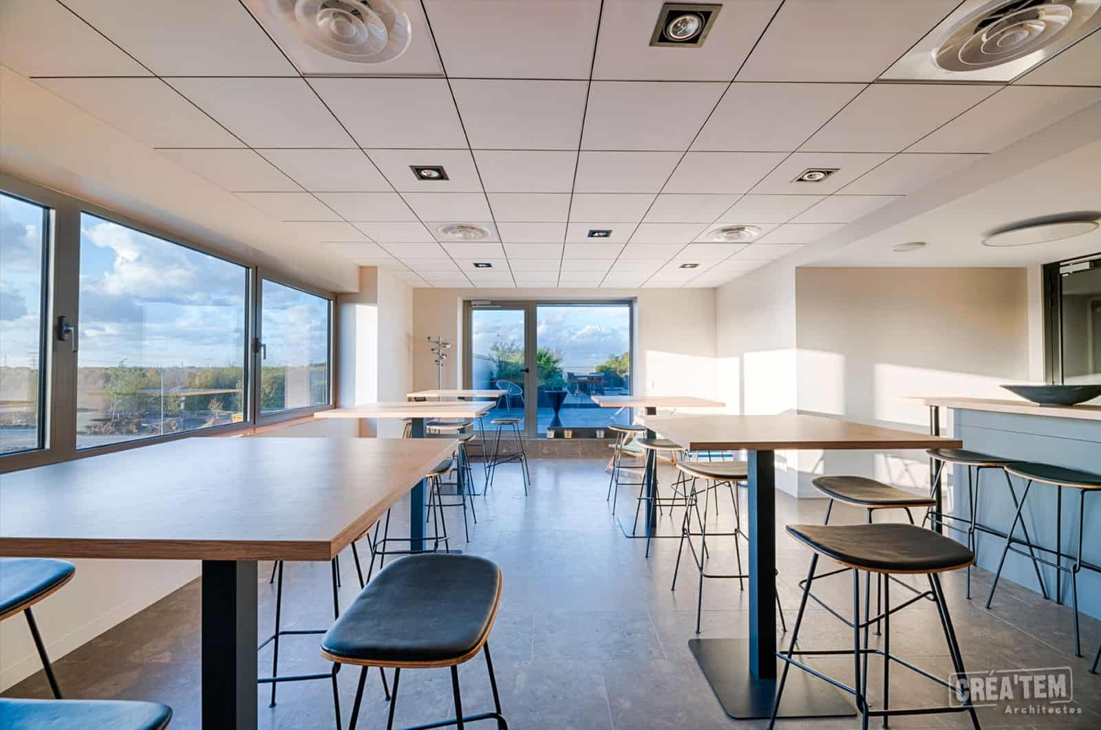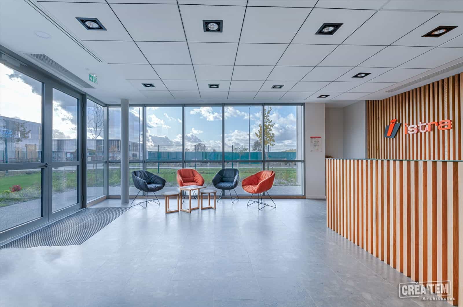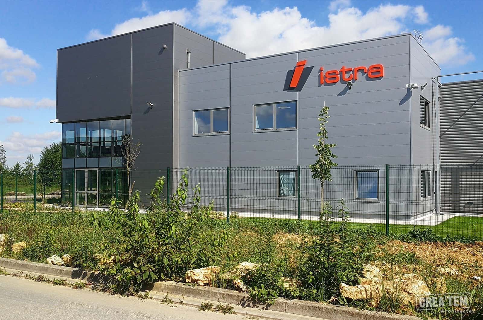 Situé dans la ZAC Lamirault à Collégien, le nouveau siège social de l’entreprise ISTRA/KORTA se déploie au sein d’un bâtiment de bureaux de 800 m2 sur 3 niveaux, d’une terrasse végétalisée et d’un entrepôt de 700 m2. Le bâtiment accueillant les bureaux est composé de 3 volumes et est recouvert par un bardage gris. Un mur rideau vitré sur deux niveaux vient marquer l’entrée.